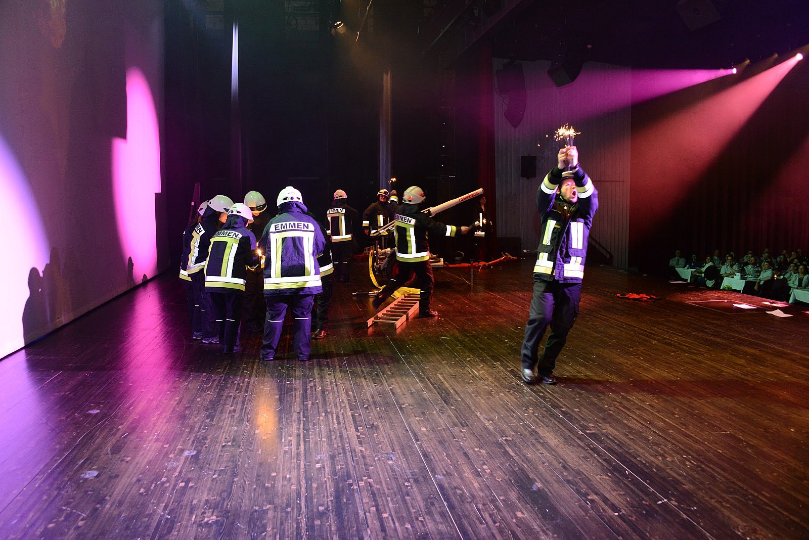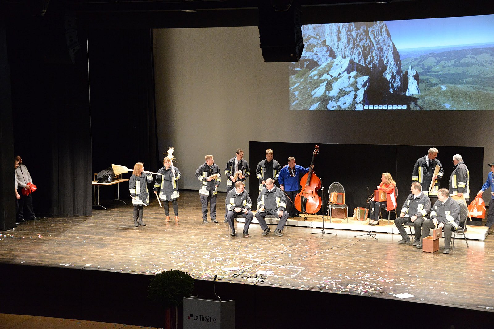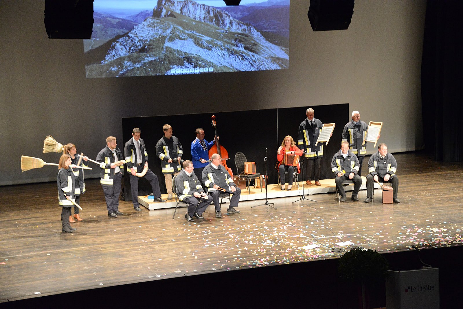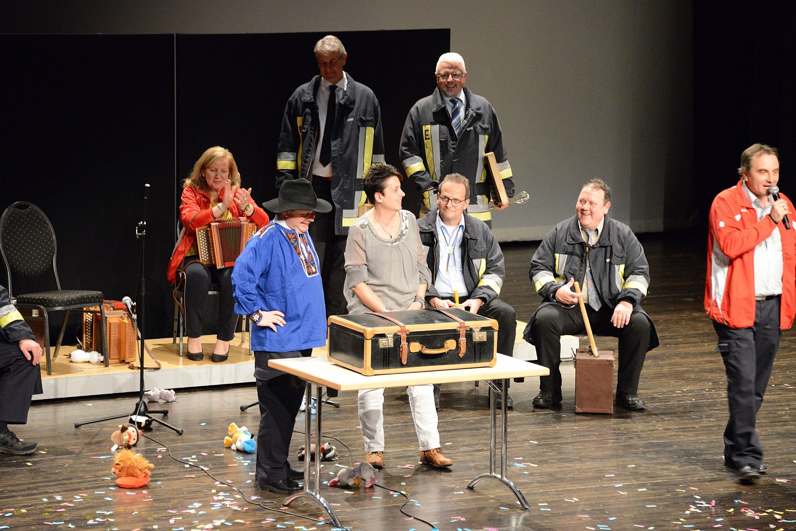 Nach dem feinen Dessert folgte der Schluss-Akt. Unter der Leitung von Daniel Müller wurde das weitaus bekannte Feuerwehr Emmen Ländler-Orchester zusammengestellt. Da Patrik Müller gerne Ländler hört, zeigten alle ausdauernd ihr Können. Das Orchester besetzt aus Politik, Inspektorat, Rettungsdienst, Feuerwehr und nicht zuletzt, den beiden Frauen Kommandant und Vize-Kommandant, hatte es in sich! Barbara Bannwart und Dani Müller übernahmen die Leitung und so gaben alle zwei tolle Stücke zum Besten. Wiederum tobte die Menge, Plüschtiere flogen auf die Bühne und eine Polonaise zog durch den Saal. Gigantisch!