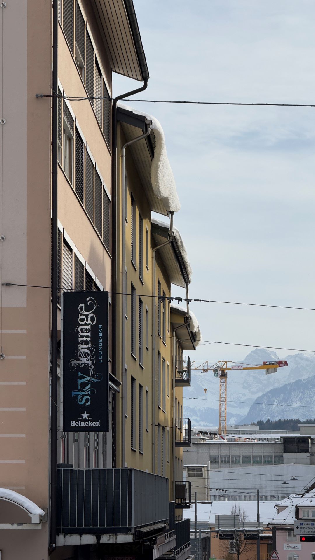 Massive Schneemassen drohen auf den Gehweg zu fallen